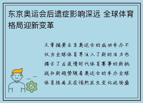 文章摘要:东京奥运会的成功举办,不仅为全球体育界注入了新的活力,也揭示了后疫情时代体育赛事的新挑战和新趋势。随着奥运会的举办,全球体育格局正在悄然发生变化。这场盛会不仅暴露了国际赛事在后疫情时代的脆弱...